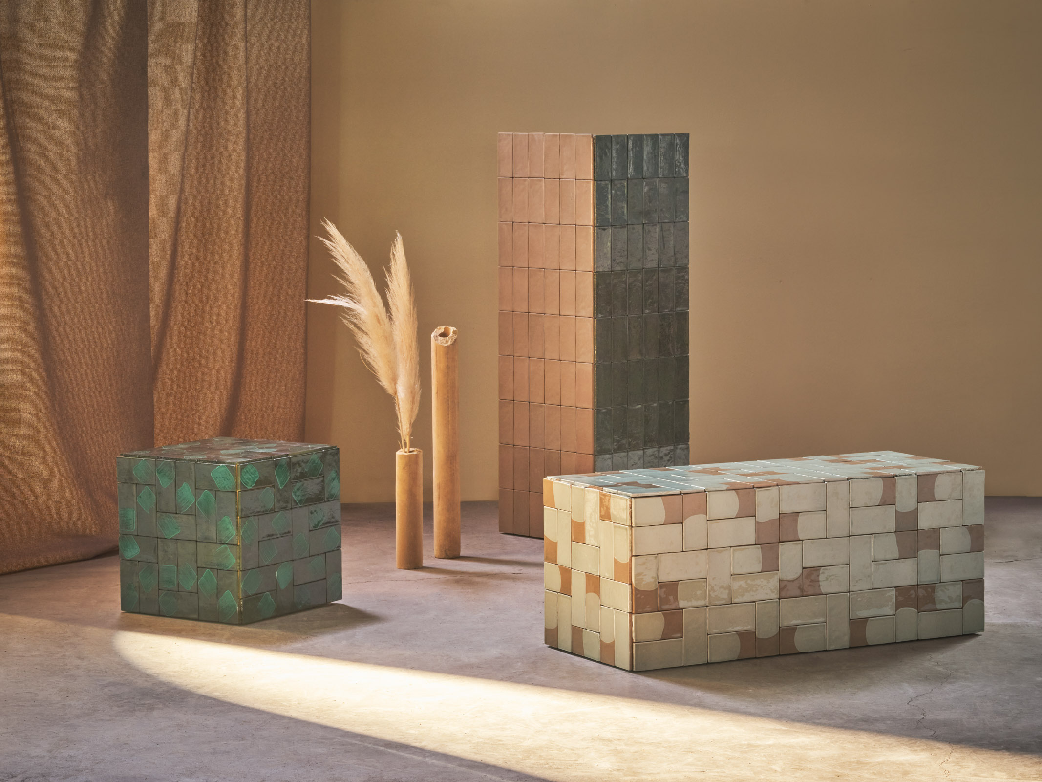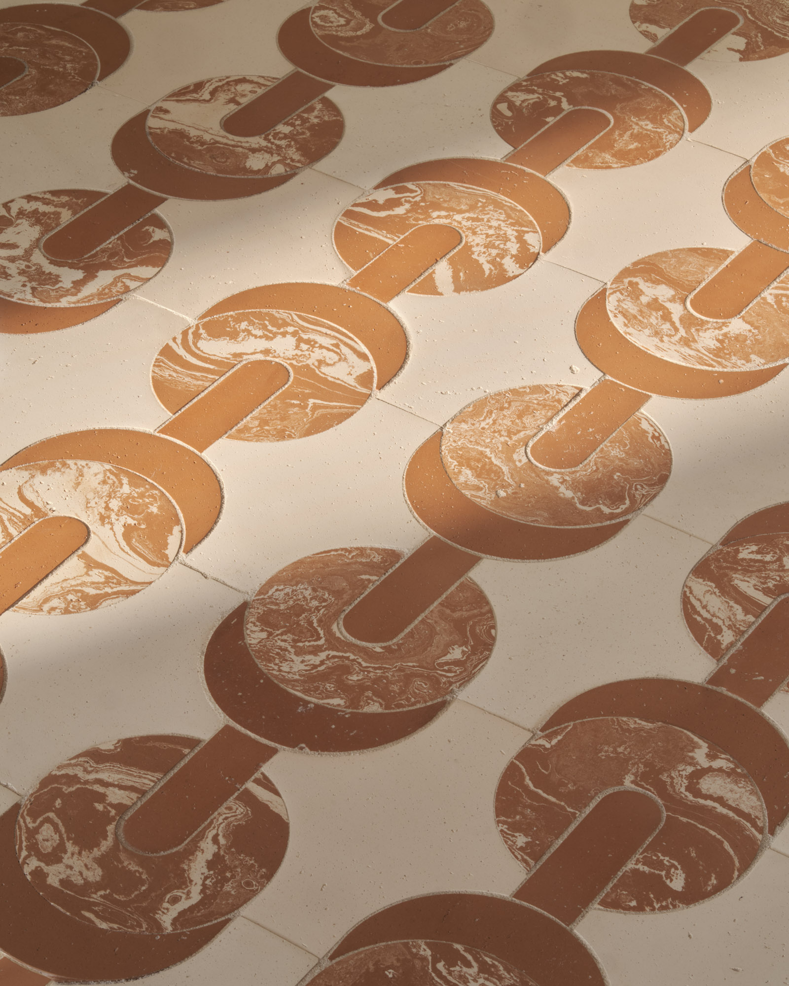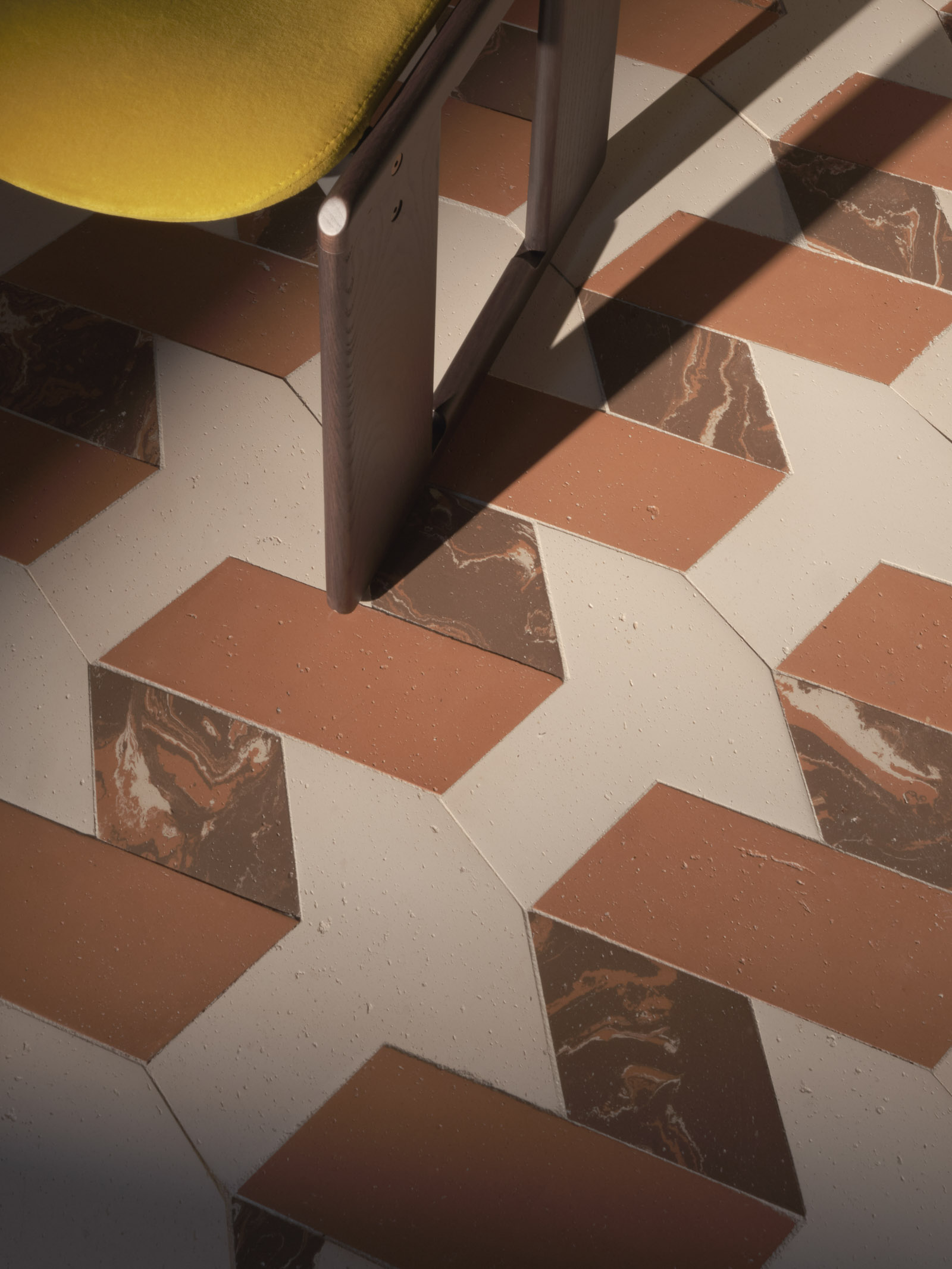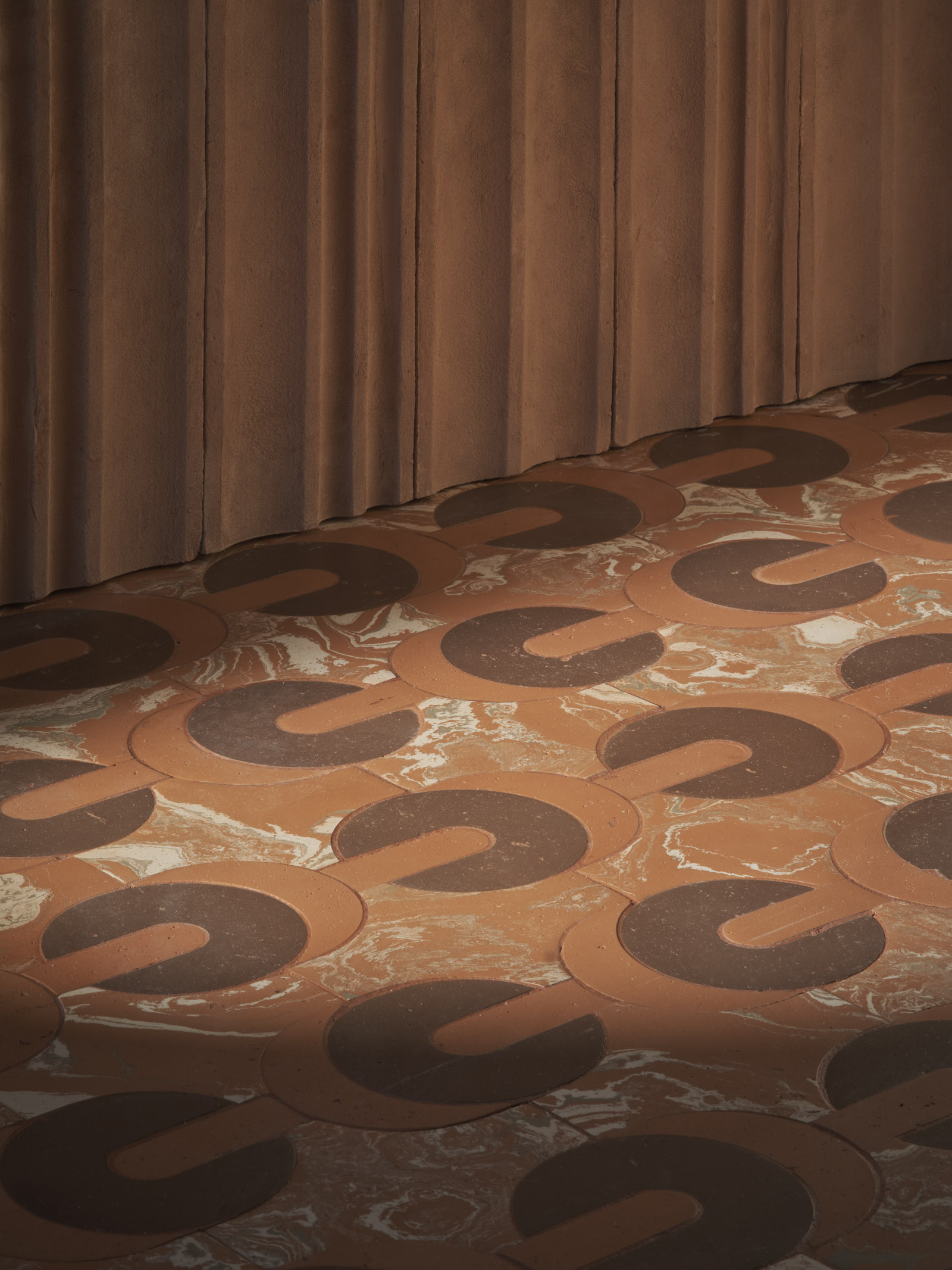 The silhouettes created, in pinkish, variegated and white terracotta, associated with denser colors, recall the geometric and polychrome work of the Cosmati, who were careful to articulate geometries and balance tones, in the name of a harmonic synthesis and in order to obtain a design tangent to the illusion.