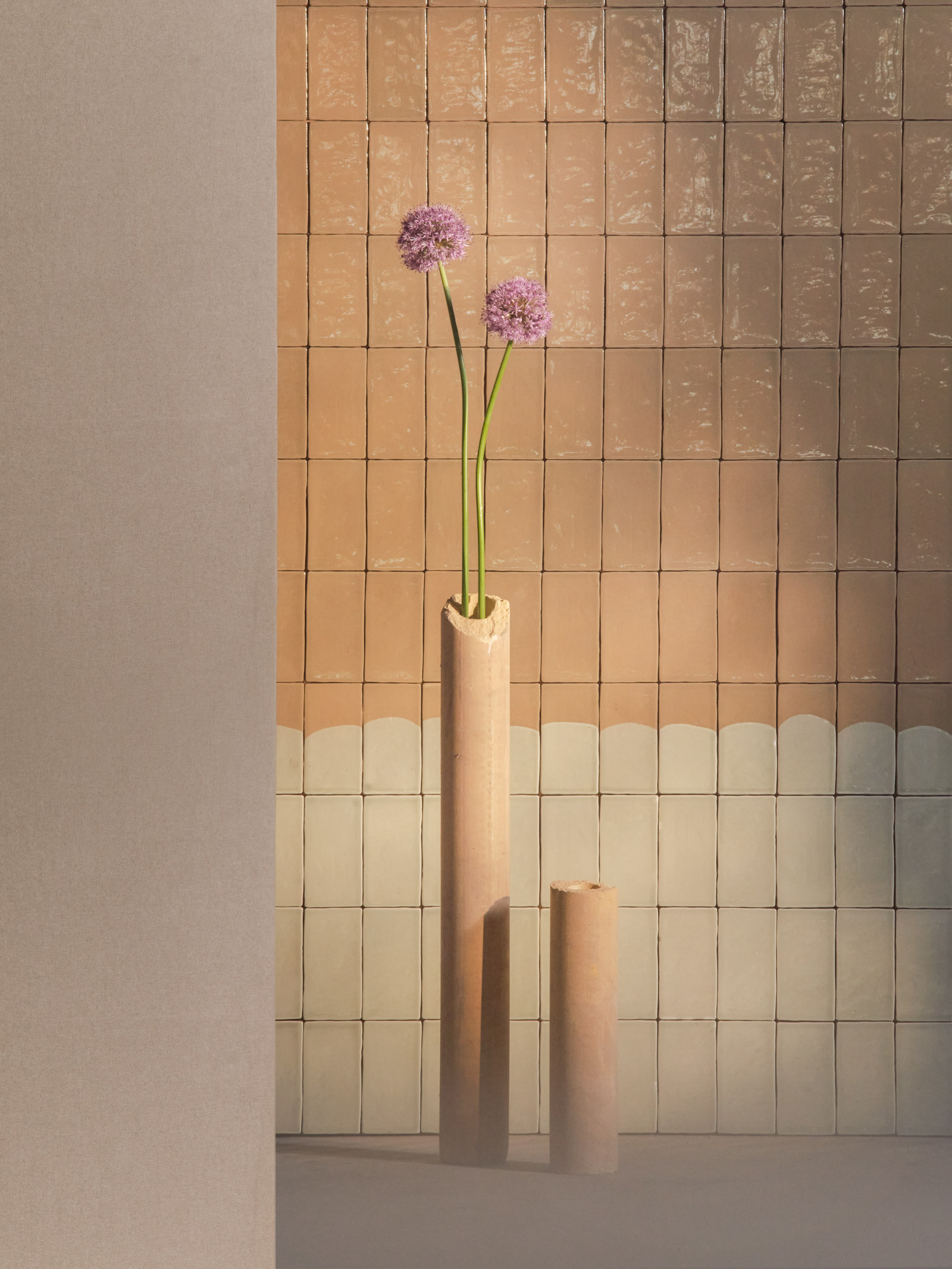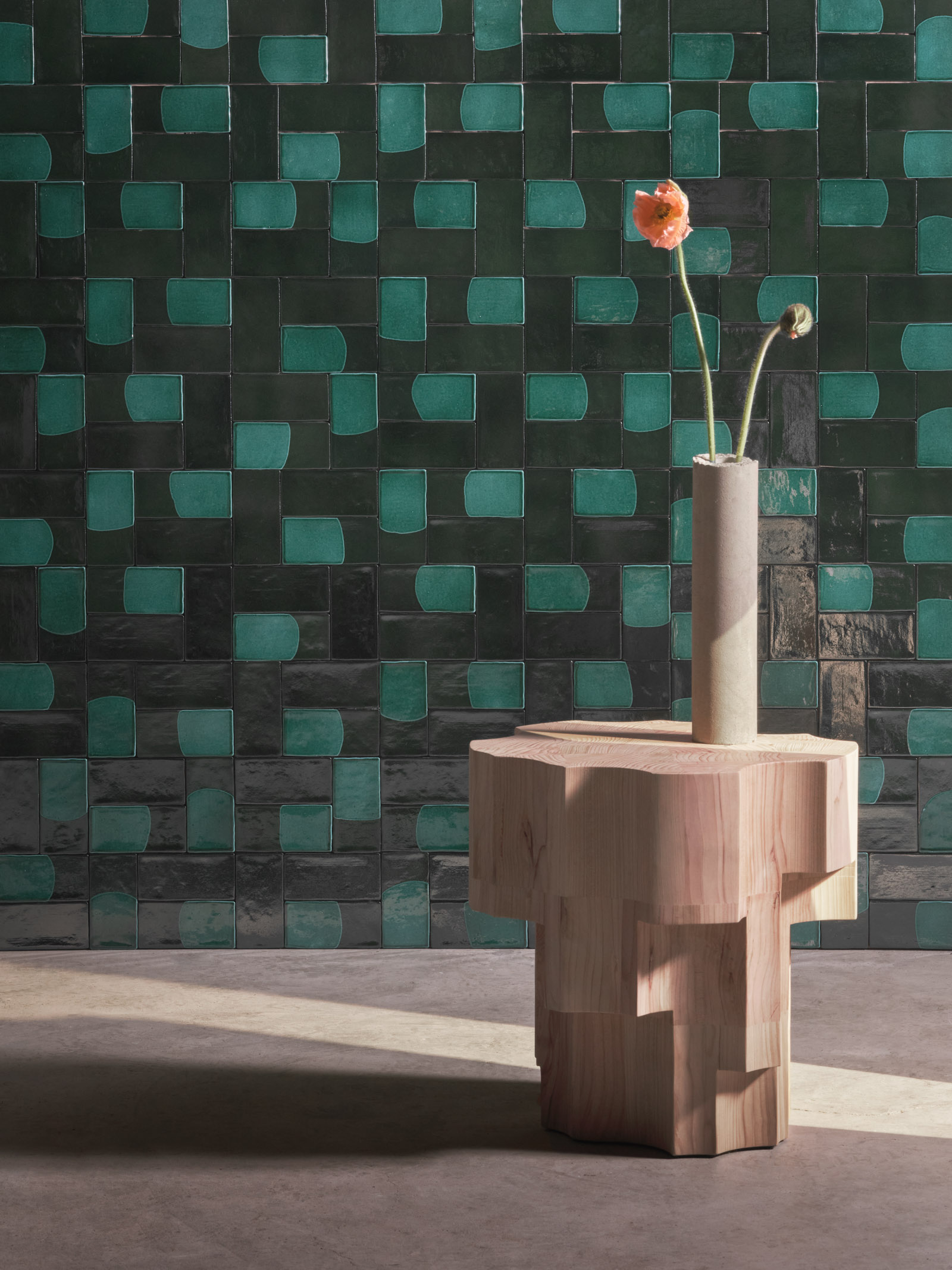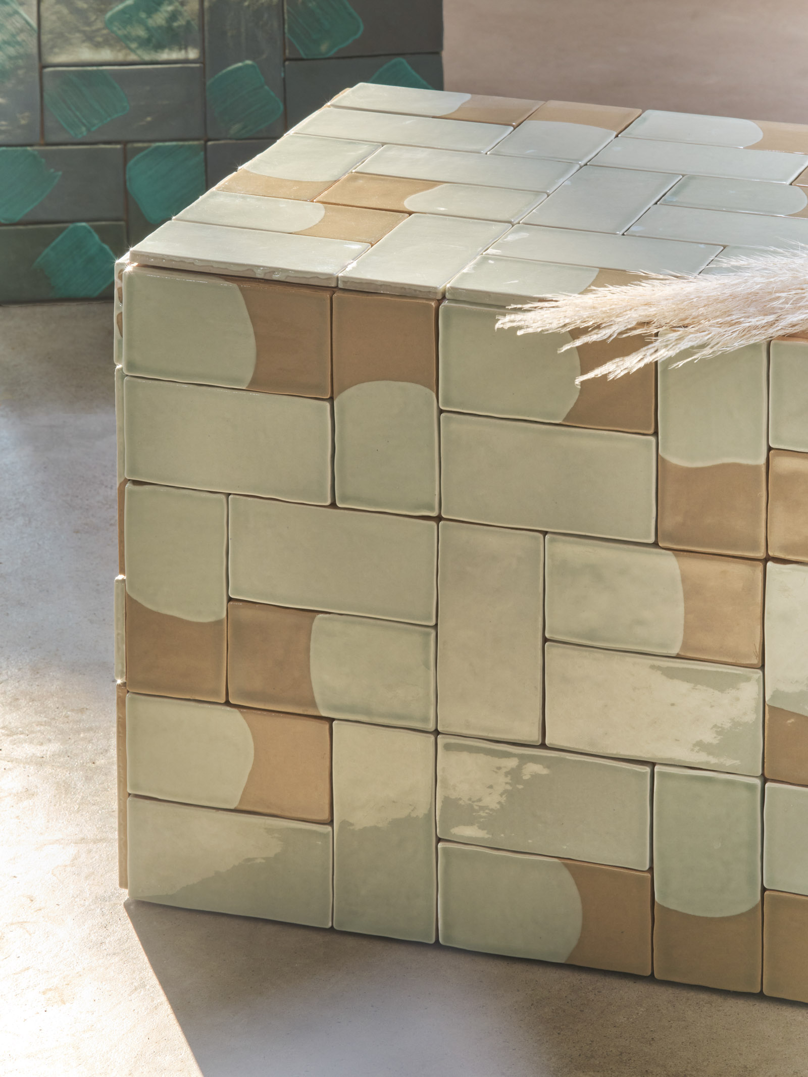 Golena — The Golena cladding is inspired by the green, flat areas along the banks of rivers, with fauna and flora characterized by periodic flooding. The colors spring from the intersections of land and water. The brilliant glaze is the result of a firing process that emphasizes the material and illuminates its depths.