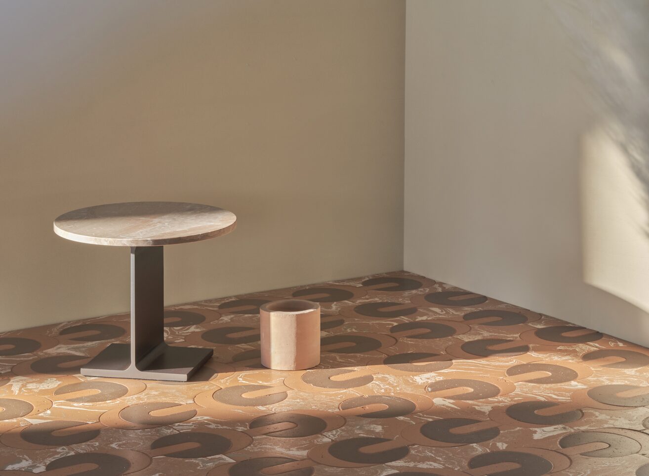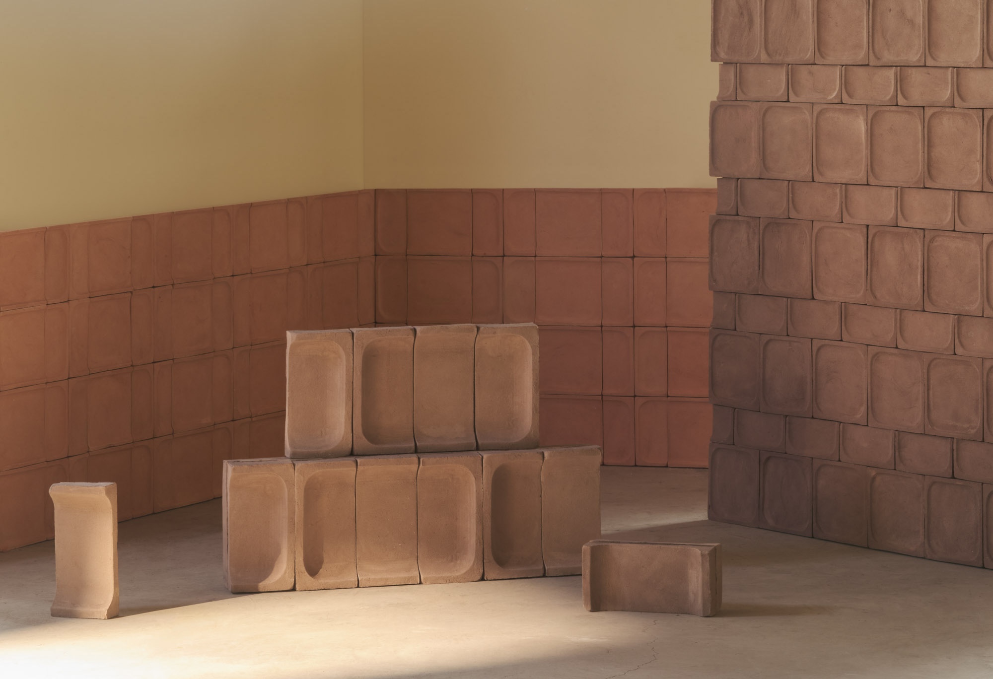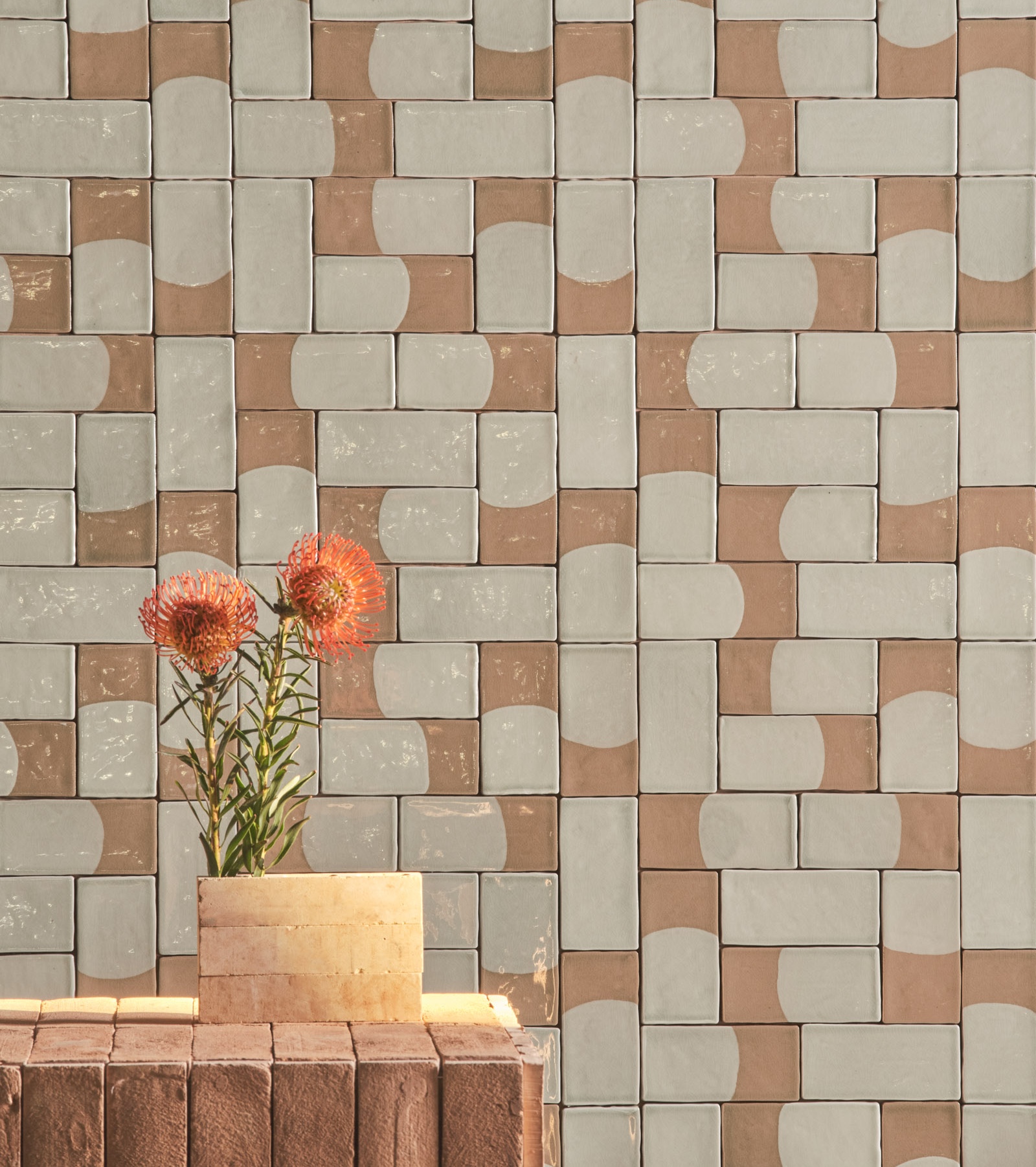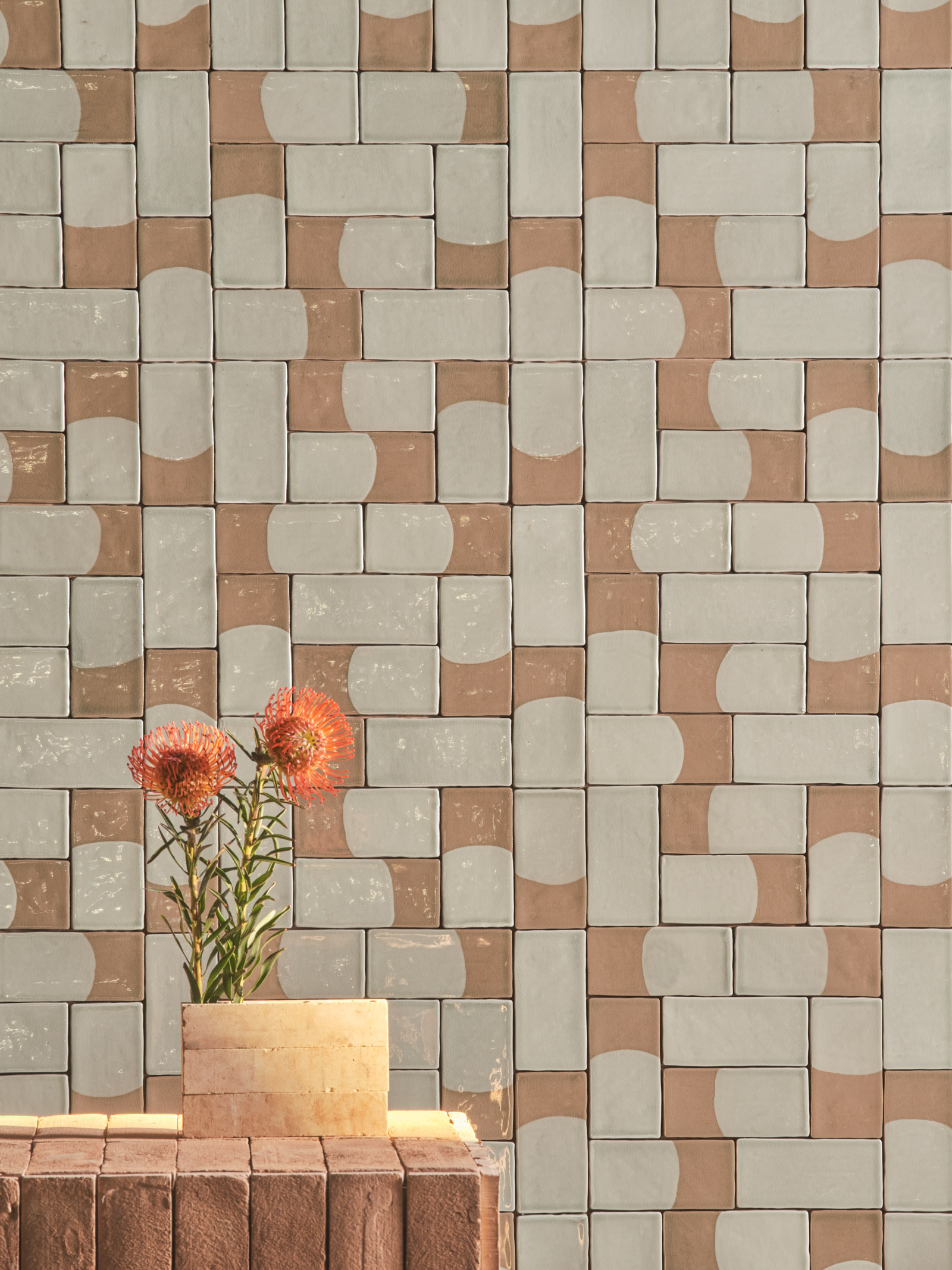 Alveo — The manual intervention here becomes accurate precision, the geometry sharply traced and the color densely brushed. The cladding composes a natural and organic mosaic, playing with tone on tone within an overlapping and layered texture, working on an earthy-inspired warp evoking the outline of river waters.