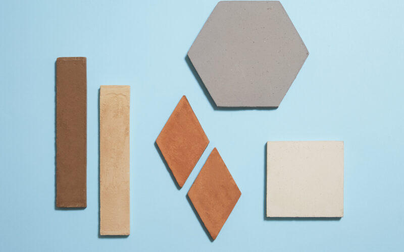 Tre piastrelle in terracotta di diversi colori e forme, su uno sfondo blu
