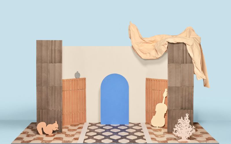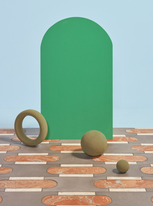 Una parete verde a forma di arco con tre oggetti di terracotta su un pavimento decorato