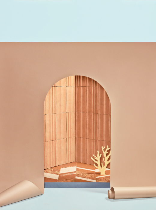 The decorative motifs are developed through the alternation of uniform and variegated cotto, with multiple chromatic combinations of the various mixtures. The same colors are applied to the cladding of walls, with four types based on classical architectural features, such as the moldings of columns and coffering.