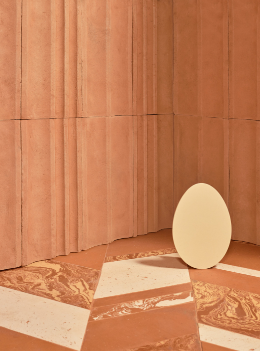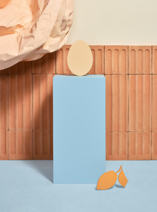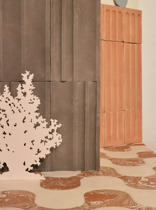 Una parete rivestita con piastrelle rettangolari in terracotta con rilievi verticali, con un disco bianco sul pavimento