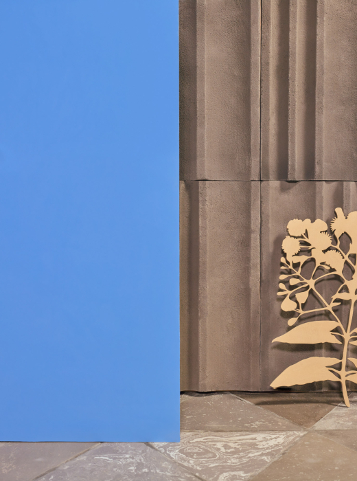 Una parete blu accanto ad una parete marrone con una pianta gialla in rilievo
