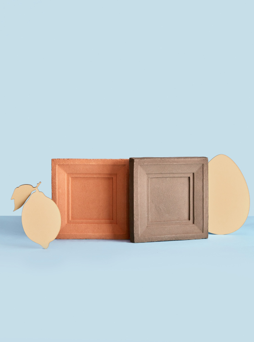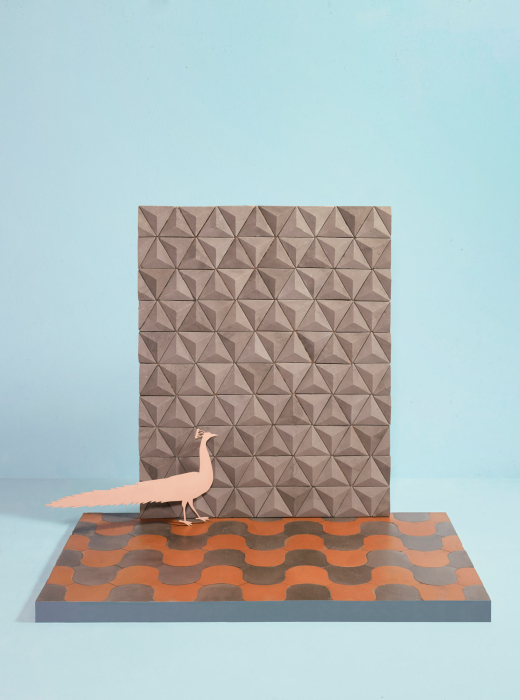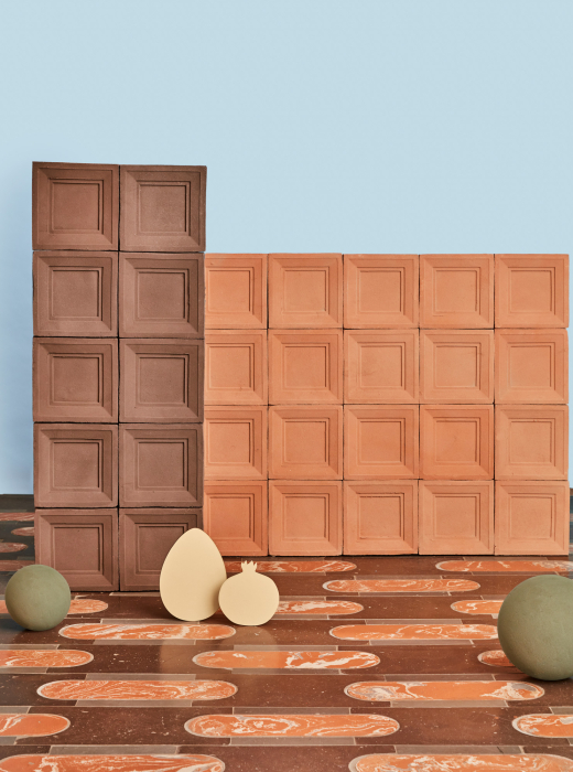 Pannelli di terracotta con motivo geometrico, appoggiati a una parete