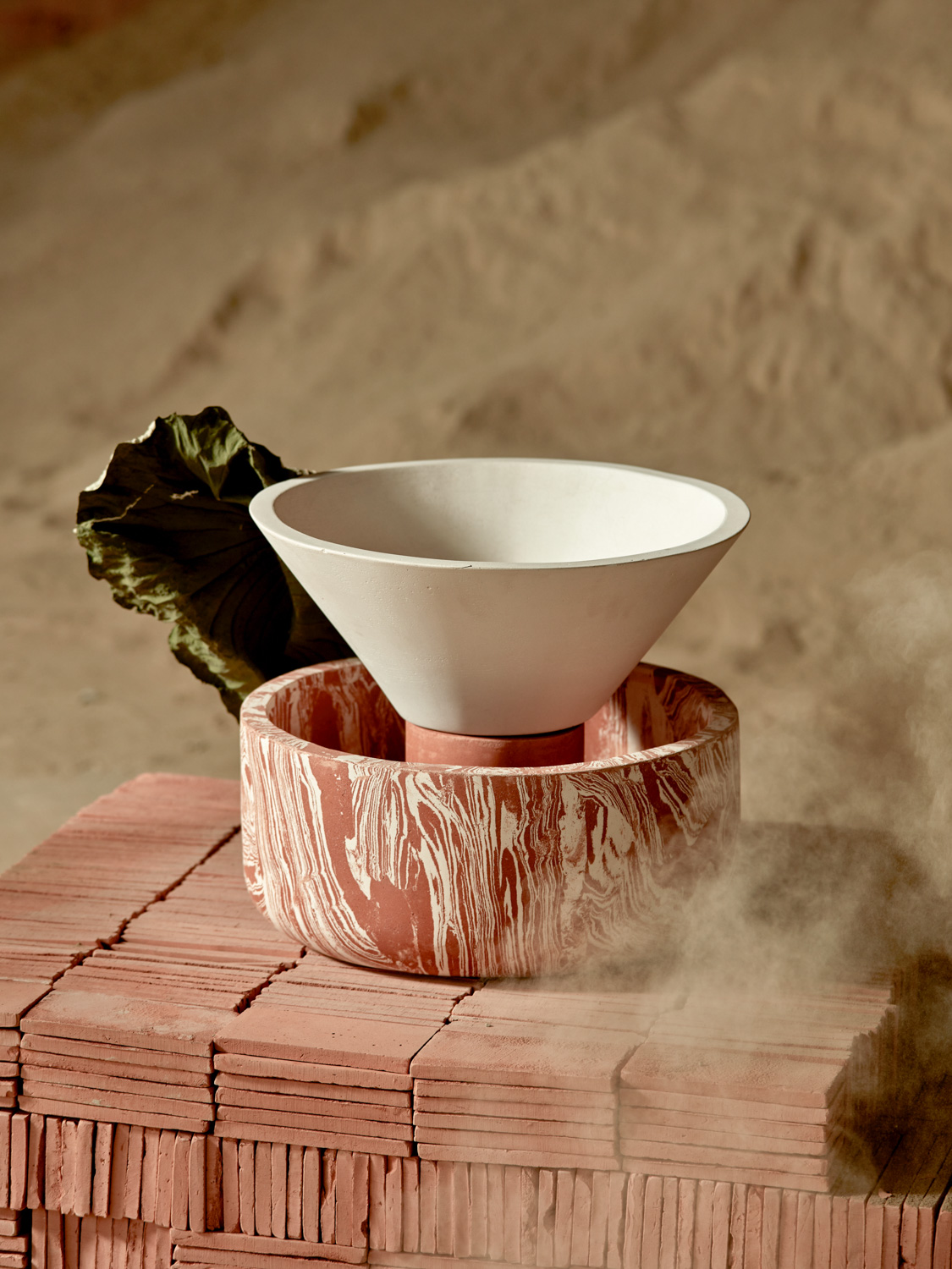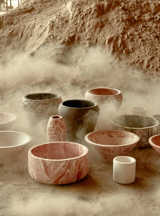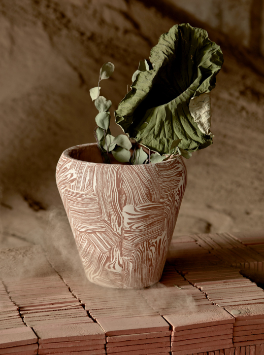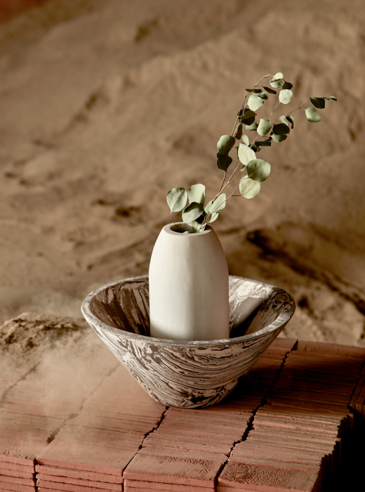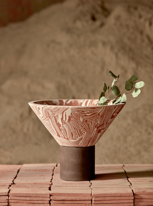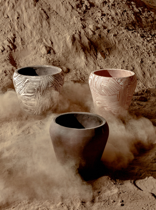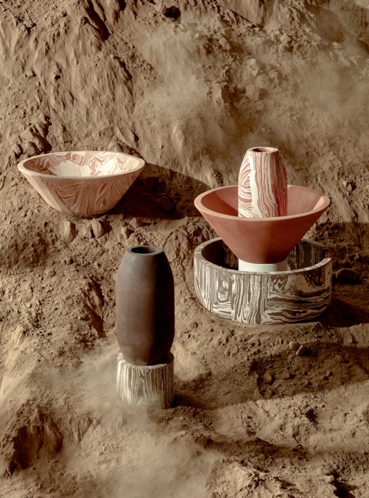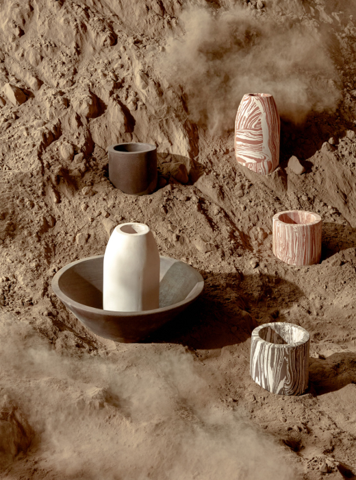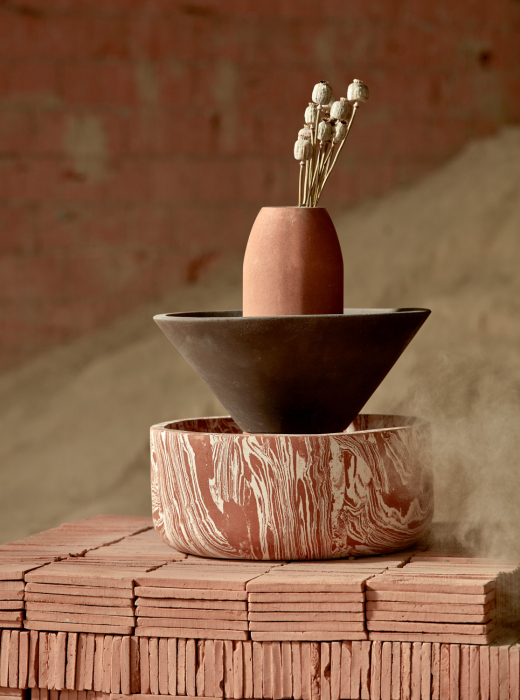 The vessels are crafted using molds, with a procedure of pressing for the various clay mixtures. The making of the mixtures by hand means that every piece unique in its two-tone texture.