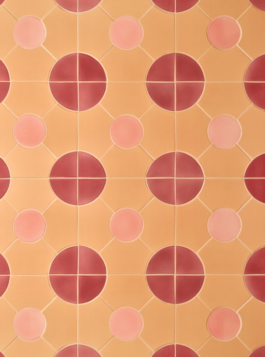 Rivestimento murale con piastrelle rosa, rosse e arancioni a forma di cerchio